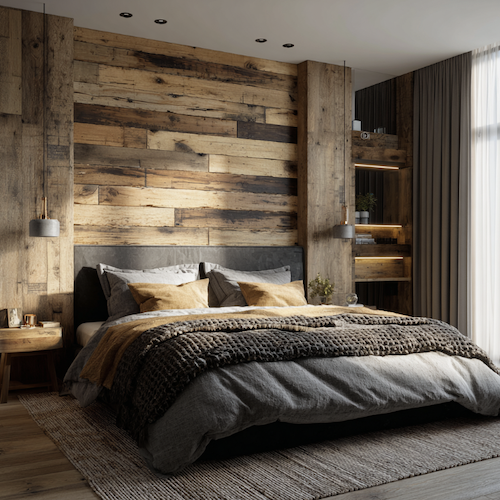 Ici, on mise sur le contraste. Une tete de lit bois foncé ou en bois recyclé se marie parfaitement avec des éléments en métal noir. Pensez à des lampes de chevet type « atelier » ou des pieds de lit métalliques.